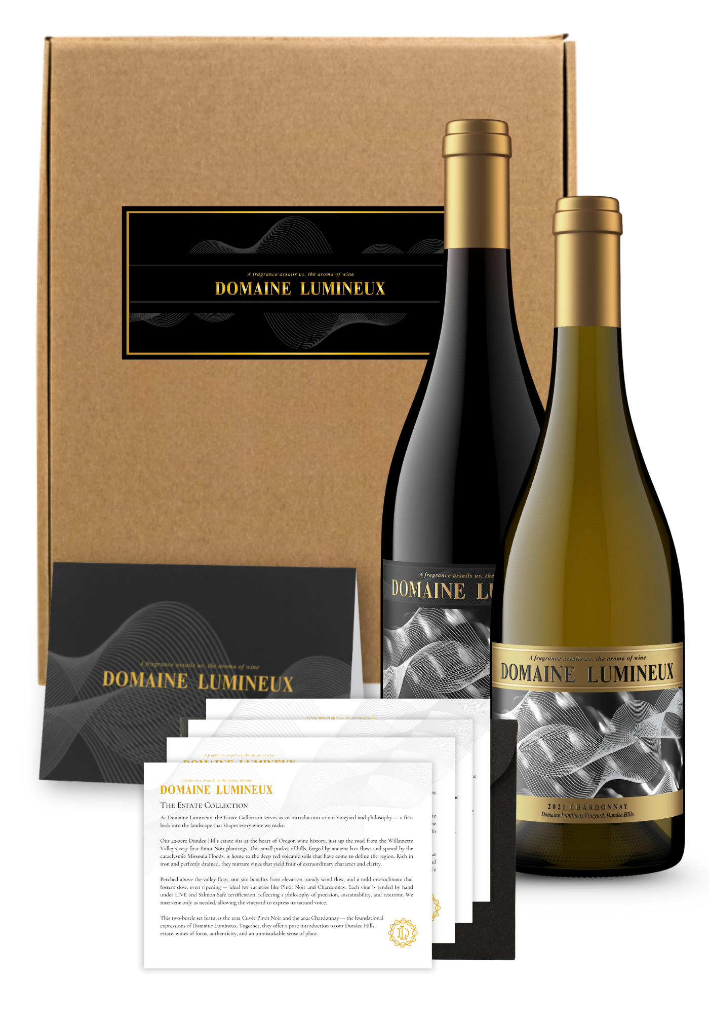 This two-bottle wine gift set features the 2021 Cuvée Pinot Noir and 2021 Chardonnay — the foundational red and white wines of the Domaine Lumineux portfolio. The Cuvée brings together nearly every Pinot Noir clone in the vineyard, offering a near complete picture of our Dundee Hills site in a single glass. The Chardonnay, sourced entirely from our limited Block I planting, reflects precision and patience in the cellar, where lees stirring and barrel aging bring texture and elegance into perfect balance.